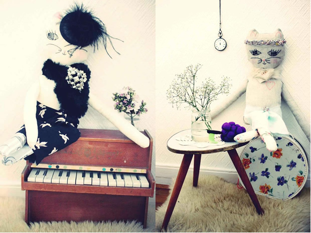 Elles sont le reflet de mon goût pour une mode rétro et extrêmement féminine, très années 50. Pour les habiller j’utilise des éléments vintage, comme le col noir en lapin sur Lily trouvé chez Emmaüs…